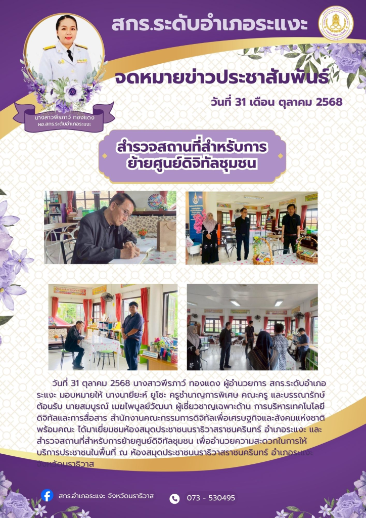วันที่ 31 ตุลาคม 2568 นางสาวพีรภาว์ ทองแดง ผู้อำนวยการ สกร.ระดับอำเภอระแงะ มอบหมายให้