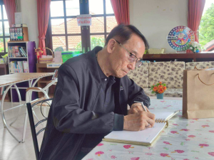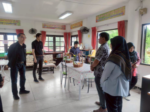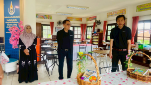 นางนายียะห์ ยูโซะ ครูชำนาญการพิเศษคณะครู และบรรณารักษ์ ต้อนรับนายสมบูรณ์ เมฆไพบูลย์วัฒนา