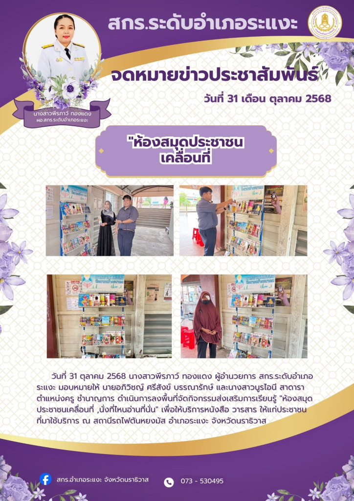 วันที่ 31 ตุลาคม 2568 นางสาวพีรภาว์ ทองแดง ผู้อำนวยการ สกร.ระดับอำเภอระแงะ มอบหมายให้ นายอภิวิชญ์ ศรีสังข์ บรรณารักษ์