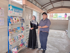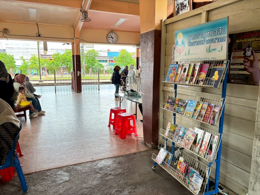 และนางสาวนูรไอนี สาดารา ตำแหน่งครู ชำนาญการดำเนินการลงพื้นที่จัดกิจกรรมส่งเสริมการเรียนรู้ “ห้องสมุดประชาชนเคลื่อนที่ ,นั่งที่ไหนอ่านที่นั่น”