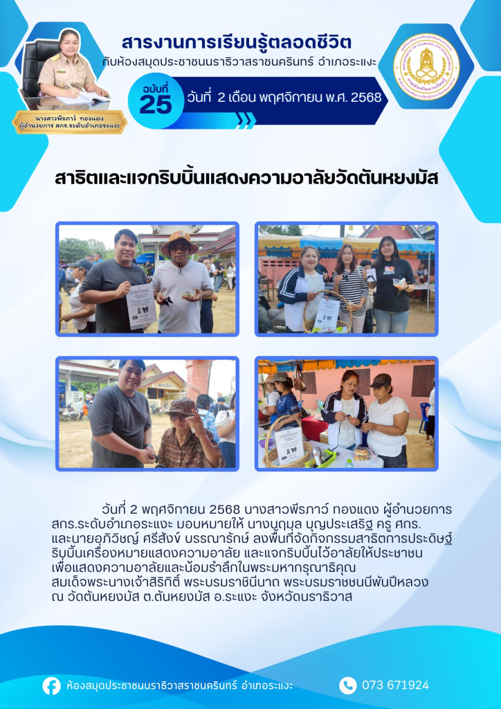 วันที่ 2 พฤศจิกายน 2568 นางสาวพีรภาว์ ทองแดง ผู้อำนวยการ สกร.ระดับอำเภอระแงะ มอบหมายให้
