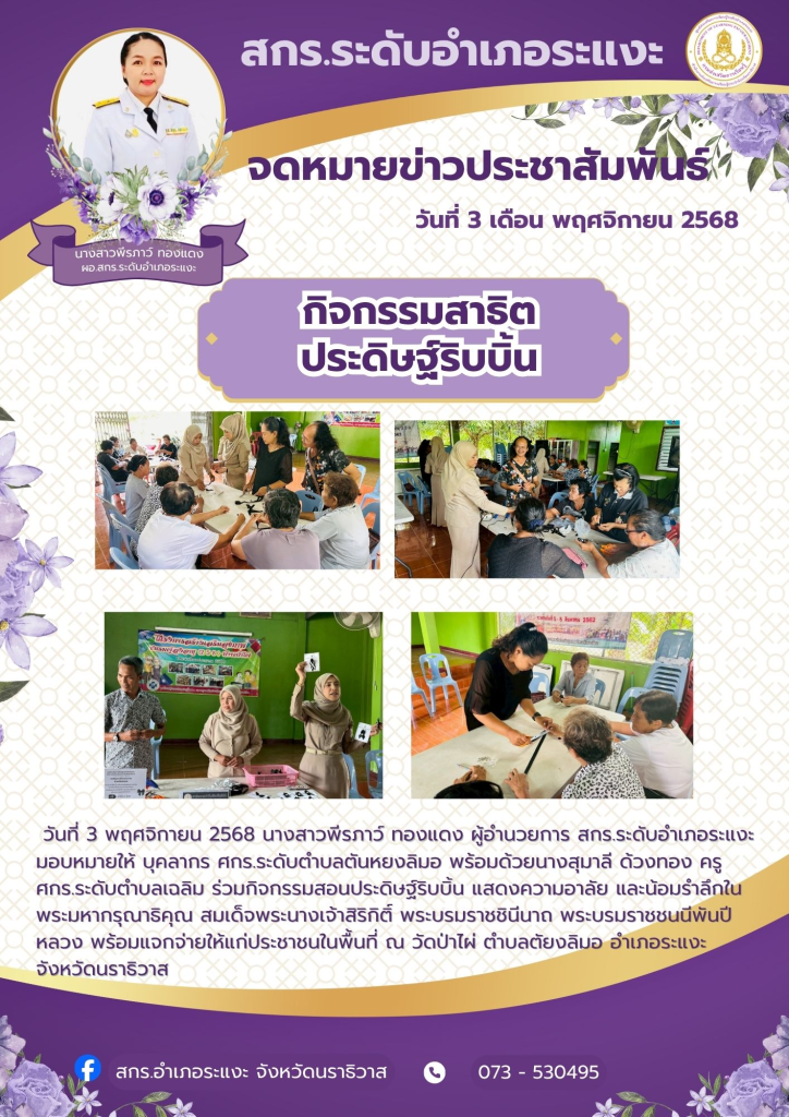 วันที่ 3 พฤศจิกายน 2568 นางสาวพีรภาว์ ทองแดง ผู้อำนวยการ สกร.ระดับอำเภอระแงะ มอบหมายให้