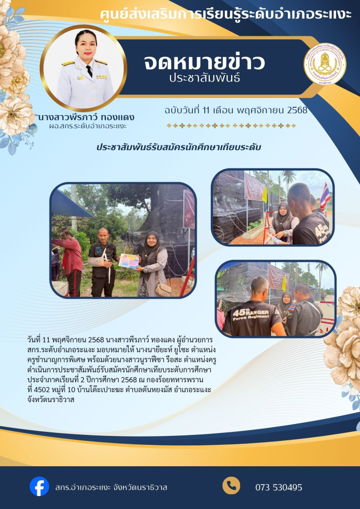 วันที่ 11 พฤศจิกายน 2568 นางสาวพีรภาว์ ทองแดง ผู้อำนวยการ สกร.ระดับอำเภอระแงะ มอบหมายให้