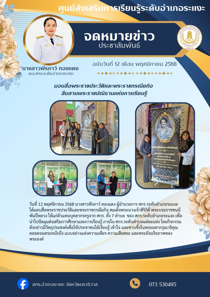 วันที่ 12 พฤศจิกายน 2568 นางสาวพีรภาว์ ทองแดง ผู้อำนวยการ สกร.ระดับอำเภอระแงะ