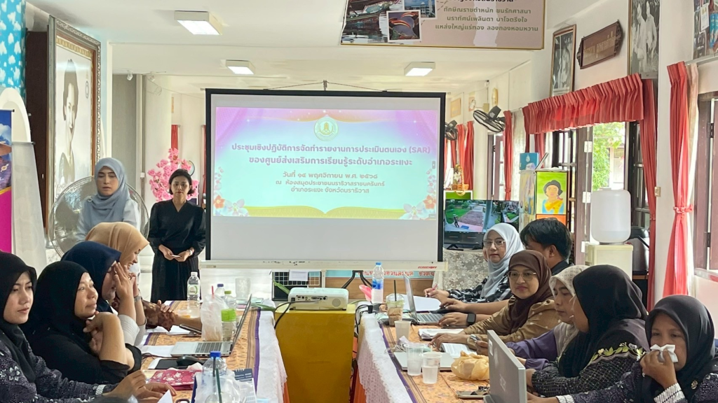 ของศูนย์ส่งเสริมการเรียนรู้ระดับอำเภอระแงะ ประจำปีงบประมาณ พ.ศ. 2568 โดยมีการบรรยายทบทวน เรื่อง “แนวทางการจัดทำรายงานการประเมินตนเอง (Self Assessment Report : SAR) ตามเกณฑ์มาตรฐานการศึกษา เพื่อให้บุคลากรในสังกัดมีความรู้ ความเข้าใจเกี่ยวกับหลักการ ความสำคัญ เกณฑ์การดำเนินงานประกันคุณภาพภายในสถานศึกษา สามารถดำเนินการประเมินคุณภาพภายในและจัดทำรายงานการประเมินตนเองได้อย่างถูกต้องครบถ้วน ณ ห้องสมุดประชาชนนราธิวาสราชนครินทร์ อำเภอระแงะ จังหวัดนราธิวาส
